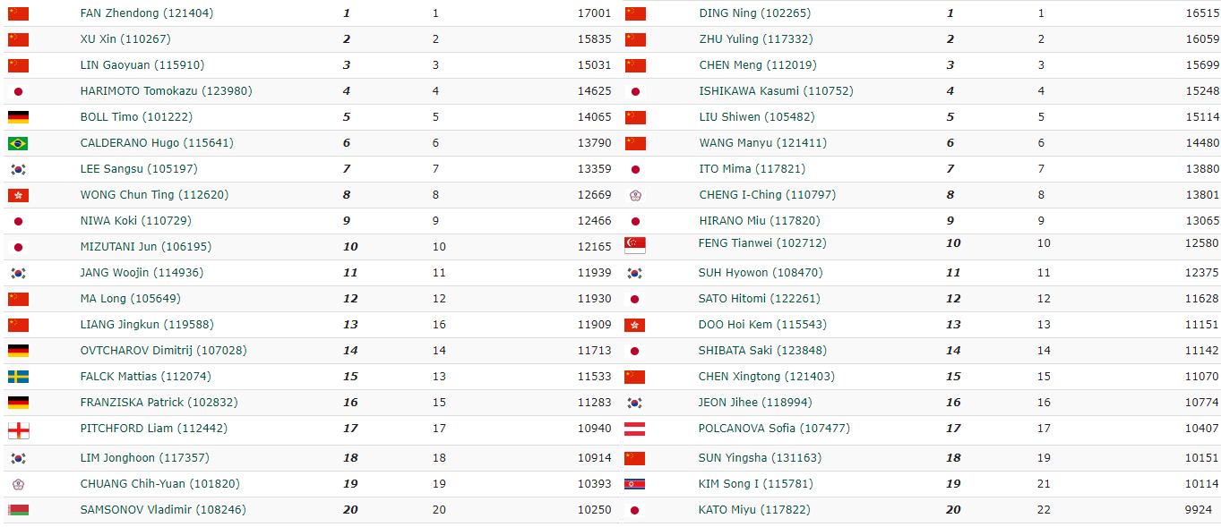 Вообще, любопытно, что в десятке сильнейших мужчин нет ни единого изменения. В феврале было сыграно мало турниров, и в первую очередь – европейские, а их представителей в десятке практически нет. После Жендонга идут Сюй Синь, Линь Гаоюань (оба – Китай), Томоказу Харимото (Япония), Тимо Болль (Германия), Уго Кальдерано (Бразилия), Ли Сангсу (Корея), Вонг Чун Тинг (Гонконг), Коки Нива и Дзюн Мизутани (оба – Япония). Льянг Цзинькун все ближе к десятке сильнейших – он взобрался уже на 13-е место благодаря победе в Португалии. В остальном, изменений в рейтинге, ввиду малого количества знаковых событий, практически нет. Даже Дмитрий Овчаров, несмотря на победу на Топ-16 Европы, из-за особенностей начисления баллов, остался на 14-м месте.