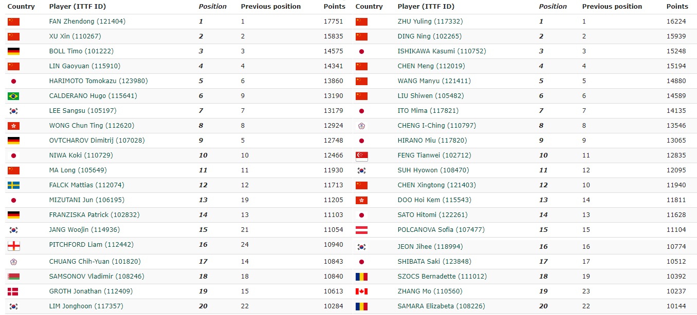 Потрясающую стабильность продемонстрировали в ноябре лучшие девушки мира: девять позиций из десяти сильнейших остались неизменными. Лидирует по-прежнему китаянка Чжу Юлинь, а за ней следует верная свита из азиатских спортсменок: Динь Нин, Касуми Ишикава, Чен Менг, Ванг Манью, Лю Сивэнь, Мима Ито, Чен Ичинь и Мию Хирано. Поменялось лишь десятое место – сингапурская теннисистка Фэнь Тянвэй сместила еще одну китаянку, Чен Синьтонг.